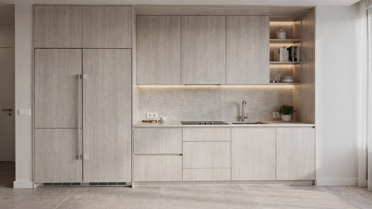 A lógica é direta: criar um módulo de armário com as medidas certas e revestir a frente com o mesmo material, cor e padrão do restante da marcenaria. Assim, o eletro some do campo de visão e vira parte do todo. Esse truque entrega um design minimalista sem esforço e transforma a cozinha em um bloco único, sem “quebras” de inox, branco ou adesivo fora de contexto.