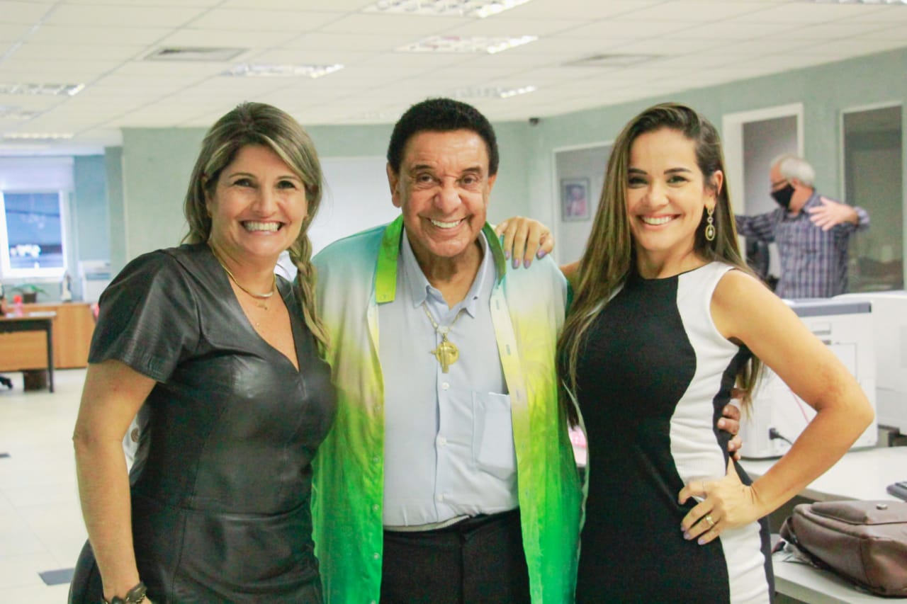 Márcia Pinho (à esquerda) e Isabele Benito (à direita) entrevistam o cantor Agnaldo Timóteo. Foto: Talita Giudice/ TUPI