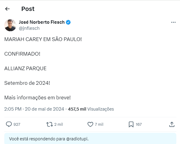 Confirmada como atração principal do Palco Sunset no próximo Rock in Rio, Mariah Carey também irá fazer um show em São Paulo. A notícia foi confirmada pelo jornalista José Norberto Flesch nesta segunda-feira (20). Segundo ele, a apresentação pode ser dada como certa, e que mais informações serão passadas em breve.