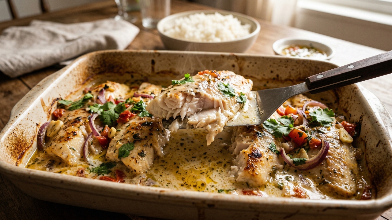 Em uma assadeira, crie uma cama com rodelas finas de batata e cebola já pré-cozidas. Disponha os filés de peixe sobre os legumes e adicione tomates-cereja. Leve ao forno preaquecido a 200°C por cerca de 20 a 25 minutos, ou até que o peixe esteja macio e as batatas, douradas. Sirva com arroz branco.