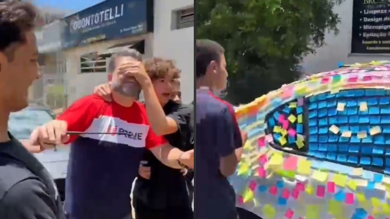 Um professor de redação teve o carro coberto por post-its ao deixar a escola em Bauru, São Paulo. A ação foi organizada por alunos do ensino médio, que usaram a surpresa para convidar Guido Dal Col Netto para ser o paraninfo da formatura. O vídeo do momento viralizou nas redes sociais.