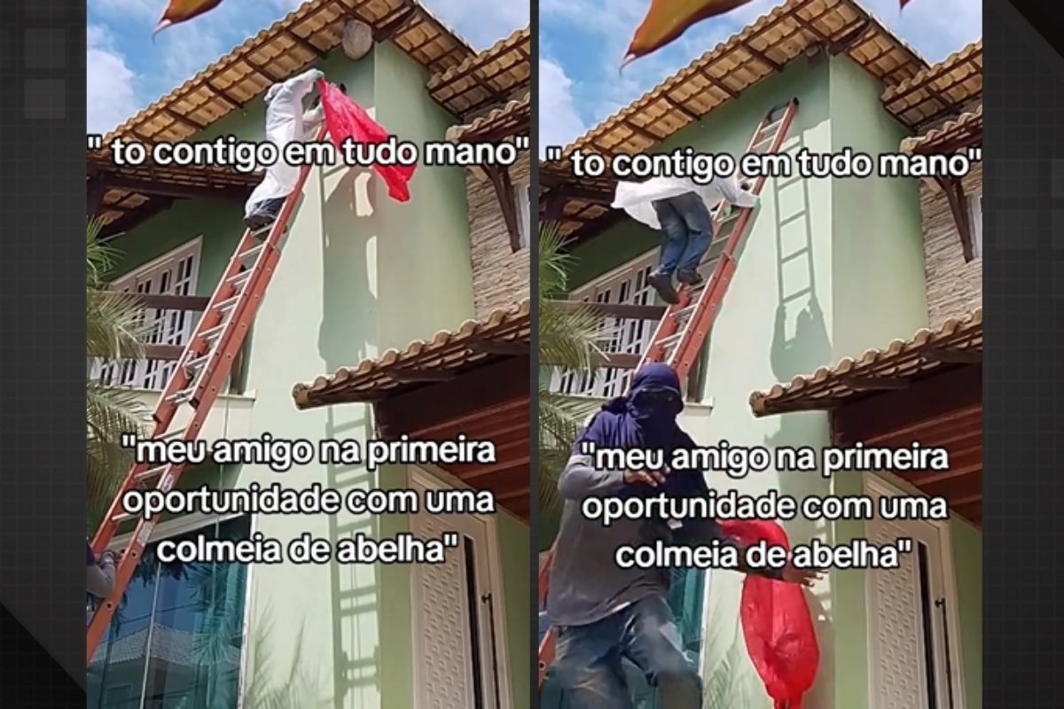 Um vídeo que circula nas redes sociais está arrancando gargalhadas dos internautas. Na gravação, um homem sobe em uma escada para remover uma colmeia, enquanto o amigo tenta tranquilizá-lo com uma garantia: “Pode subir tranquilo, tô te segurando aqui!”