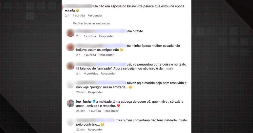 Entre as reações, um internauta questionou: “Ela não era esposa do Bruno? Vixe, parece que estou na época errada”. Outro rebateu com ironia: “Leia o texto”. A discussão continuou: “Na minha época, mulher casada não beijava assim os amigos não”, comentou um seguidor, recebendo resposta de outro: “Uai, você perguntou outra coisa e no texto tá falando de amizade. Agora se beijam ou não, isso é da conta de quem é casado com ela. No caso, o Bruno.”