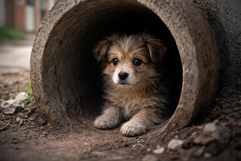 Pets em situação de rua frequentemente buscam abrigo em espaços improvisados para se proteger do frio, da chuva e de predadores. Nesse contexto, o cano de esgoto acabou se tornando um refúgio para o pequeno pet.