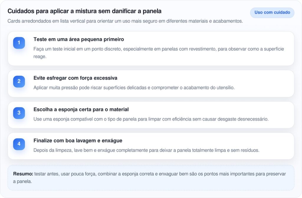 Embora a mistura seja simples, alguns cuidados ajudam a preservar os utensílios e melhorar a eficiência da limpeza. O mais importante é considerar o material da panela e evitar fricção excessiva em superfícies mais frágeis.