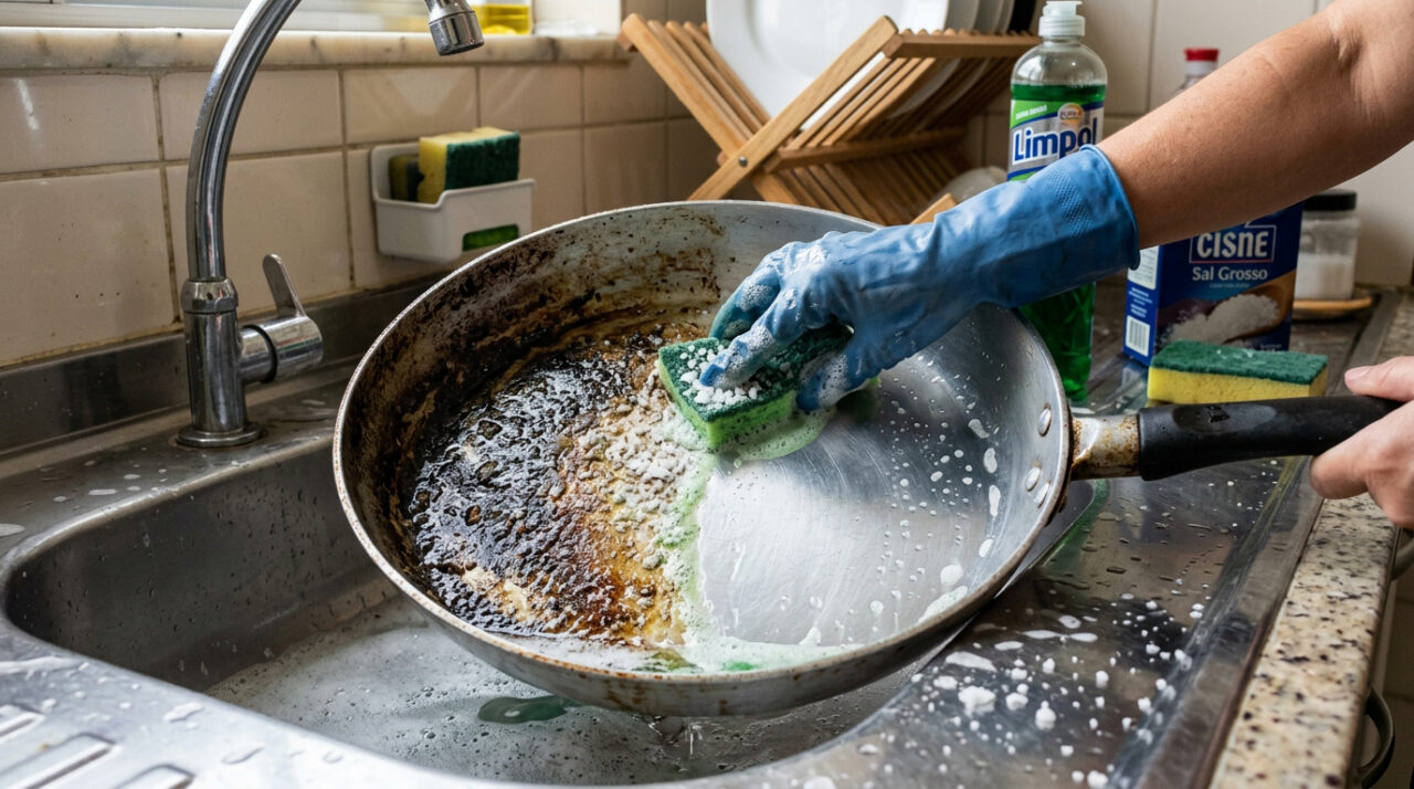 Essa combinação costuma ser usada para ajudar na remoção de gordura impregnada, sujeira grudada e marcas deixadas pelo uso frequente das panelas. O detergente atua diretamente na quebra da gordura, enquanto o sal entra como apoio mecânico, intensificando a limpeza da superfície.