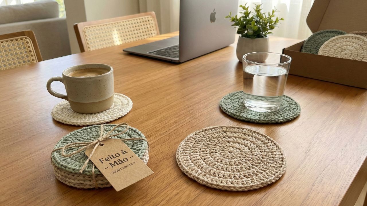 O porta-copo de crochê continua em alta em 2026 como peça funcional e decorativa, ocupando espaço em mesas de jantar, escritórios e ambientes de lazer. Além de proteger a superfície dos móveis contra marcas de copos e xícaras, esse tipo de artesanato permite o aproveitamento de sobras de fio e a criação de conjuntos personalizados, sendo opção recorrente em feiras de artesanato e vendas online por ser rápido de produzir, leve e fácil de enviar pelo correio.