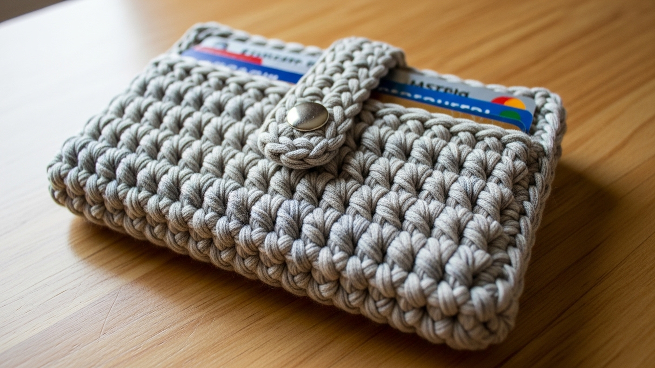 O porta-cartões de fio de malha é um acessório de crochê compacto, versátil e prático.
