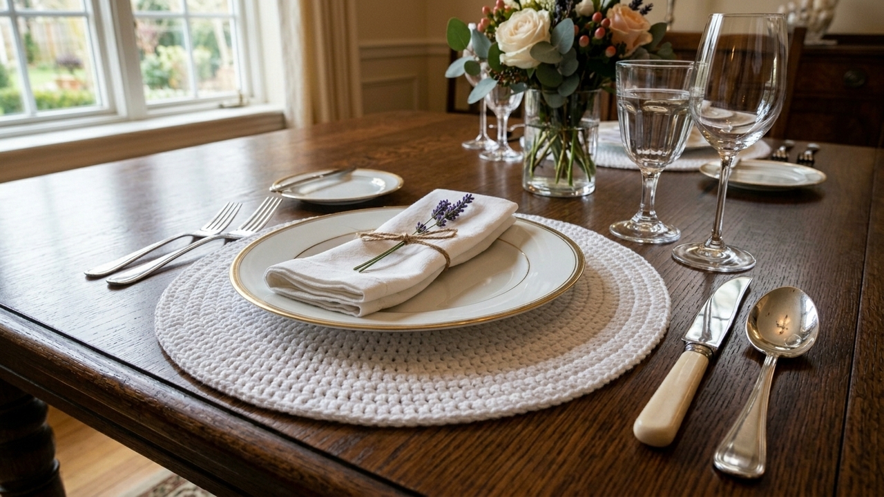 Sousplats de crochê engomados garantem firmeza e valorizam a estética da mesa.
