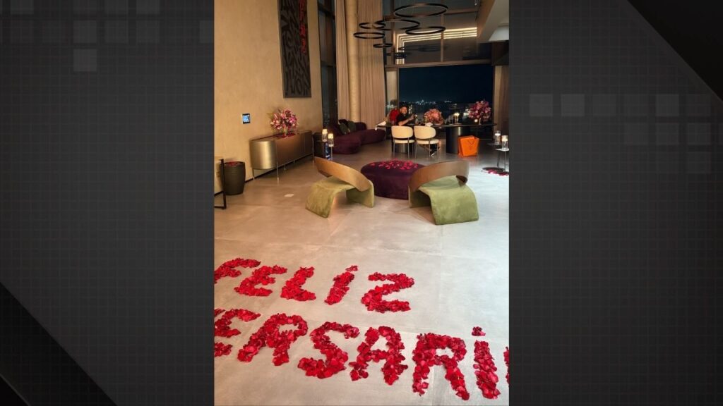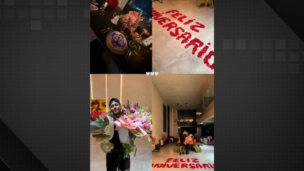 Neymar não poupou esforços para tornar o aniversário de Bruna um evento inesquecível. Em uma recepção calorosa, o jogador escreveu “Feliz aniversário” com pétalas no chão. Já o presente da Hermès, foi colocado ao lado da mesa de jantar.