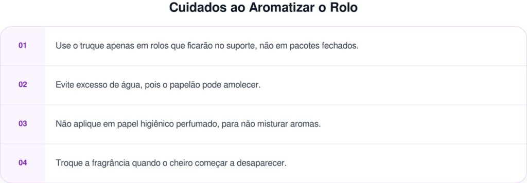 Também não misture essa receita com desinfetantes, água sanitária, álcool ou produtos de limpeza perfumados. O objetivo é criar um cheiro leve no papelão do rolo, não fazer uma mistura forte. Para o banheiro ficar realmente agradável, o perfume precisa vir depois da limpeza, não tentar esconder sujeira ou umidade.