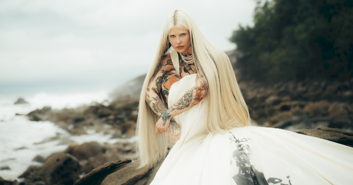 O Simbolismo: Bárbara veste um vestido de noiva com cauda pintada à mão, simbolizando o “Sim” para si mesma, para Deus e para sua missão existencial.
