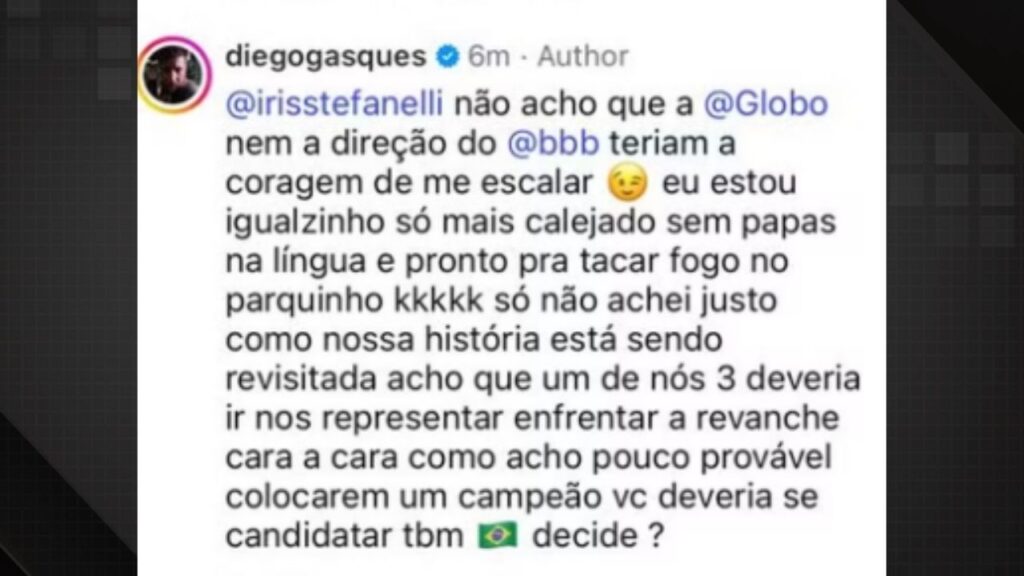 Em um comentário nas redes sociais, Íris sugeriu diretamente a volta do campeão ao reality. “Põe o Alemão”, escreveu a ex-participante. Diego respondeu de forma bem-humorada e direta, mantendo o tom que o consagrou no programa.