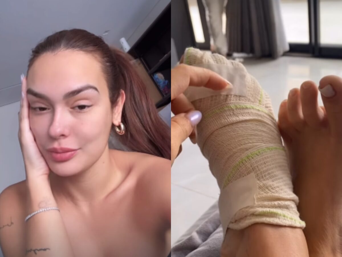 Ex-BBB Larissa Santos leva 14 pontos no pé após acidente com box do banheiro: “Dava para ver o osso”