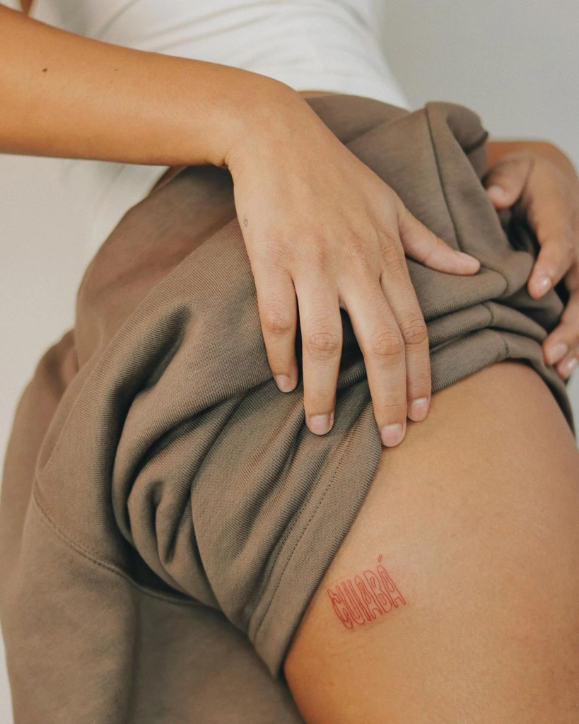 “Como a Bella é atriz, fizemos artes mais discretas, entre elas, algumas homenagens pra família, pra cidade natal, e uma que simboliza o amor dela pela vibe Brasil (corpo americano, biquíni)”, contou a tatuadora, Laly Scalada.