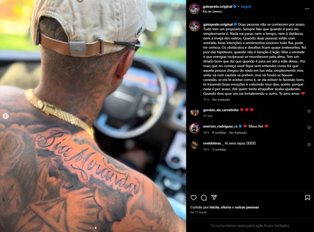 Na noite da última quinta-feira, 2, Samuel Sant’Anna, mais conhecido nas redes como Gato Preto, surpreendeu os fãs ao fazer uma declaração de amor pública para sua namorada, Bia Miranda. Utilizando seu perfil no Instagram, ele compartilhou uma série de fotos ao lado da influenciadora, mas foi a revelação de uma nova tatuagem que roubou a cena. O nome de Bia agora está eternizado no ombro do influenciador digital, simbolizando seu afeto profundo por ela.