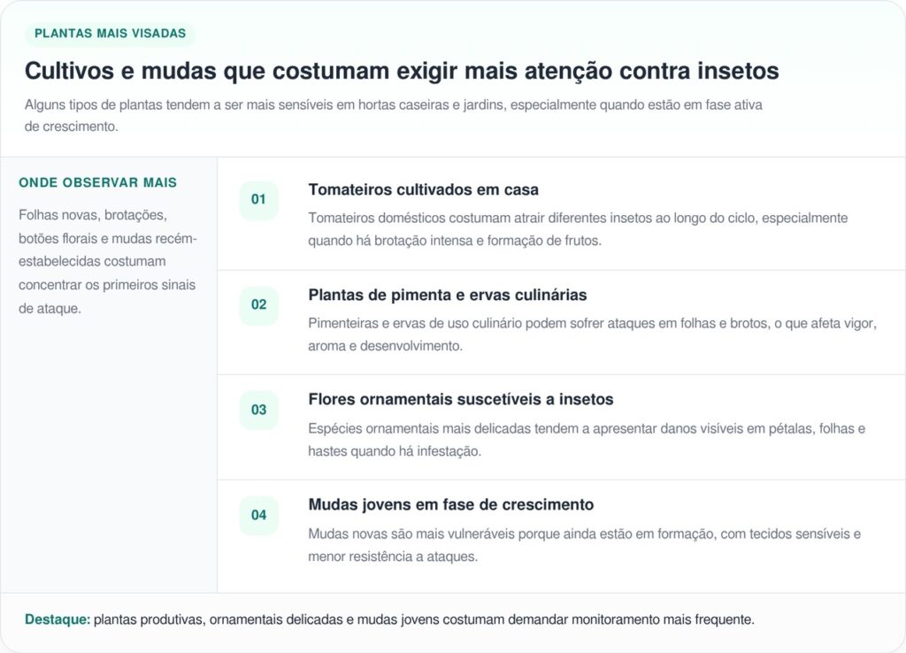 A aplicação costuma ser indicada tanto para plantas cultivadas em vasos quanto para espécies mantidas em jardins externos. O uso é comum em ervas aromáticas, hortaliças, roseiras e plantas ornamentais que apresentam folhas sensíveis ao ataque de pragas pequenas.