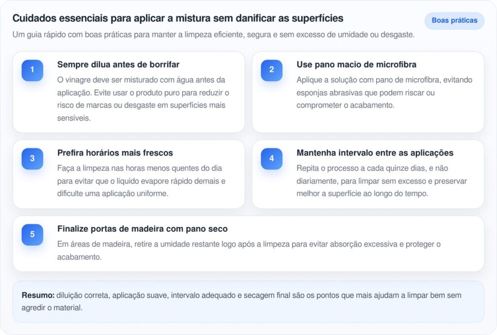 Apesar de ser suave, o ácido acético pode reagir com certos materiais se aplicado puro ou com frequência exagerada. Portas de mármore, pedras naturais e algumas madeiras envernizadas pedem cautela. O ideal é testar primeiro em um canto discreto e observar o resultado depois de alguns minutos.