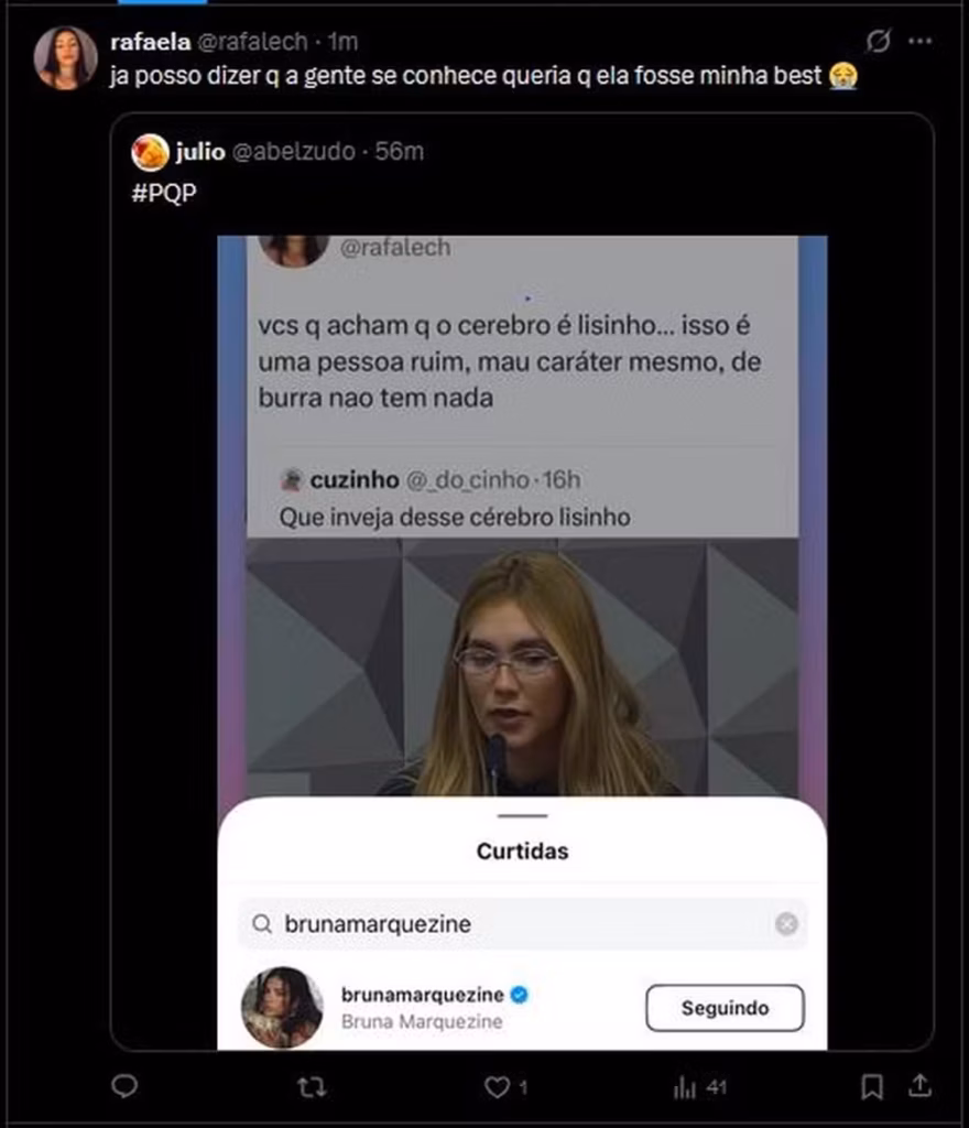 Atriz interagiu com postagem que chamava influenciadora de "mau-caráter", dias após ela depor sobre apostas onlineBruna Marquezine chamou atenção nas redes sociais ao curtir uma publicação no Instagram que criticava duramente Virginia Fonseca, logo após o depoimento da influenciadora na CPI das Bets, no Senado. No post, uma internauta afirmava que Virginia era “ruim” e “mau-caráter”, ao criticar as falas e o posicionamento da empresária.