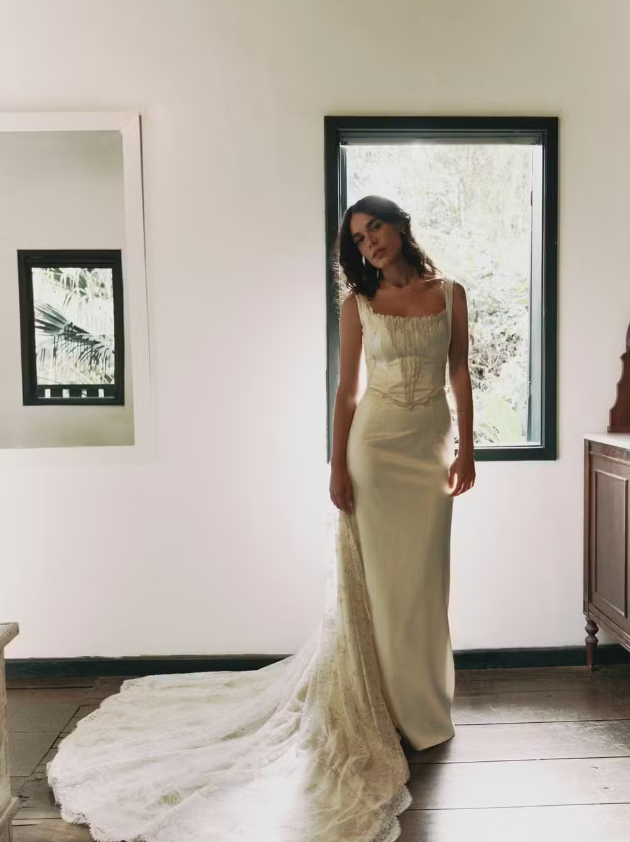 Carla usou um vestido da marca Cinq, de Los Angeles, refletindo uma aura romântica com um toque de liberdade. Ela completou o look com sapatos Gianvito Rossi, joias de Victoria Sayeg e um anel de noivado de Nathalie Edenburg. Gabriel vestiu um traje branco da Giorgio Armani. O casal foi estilizado por Rita Lazzarotti.
