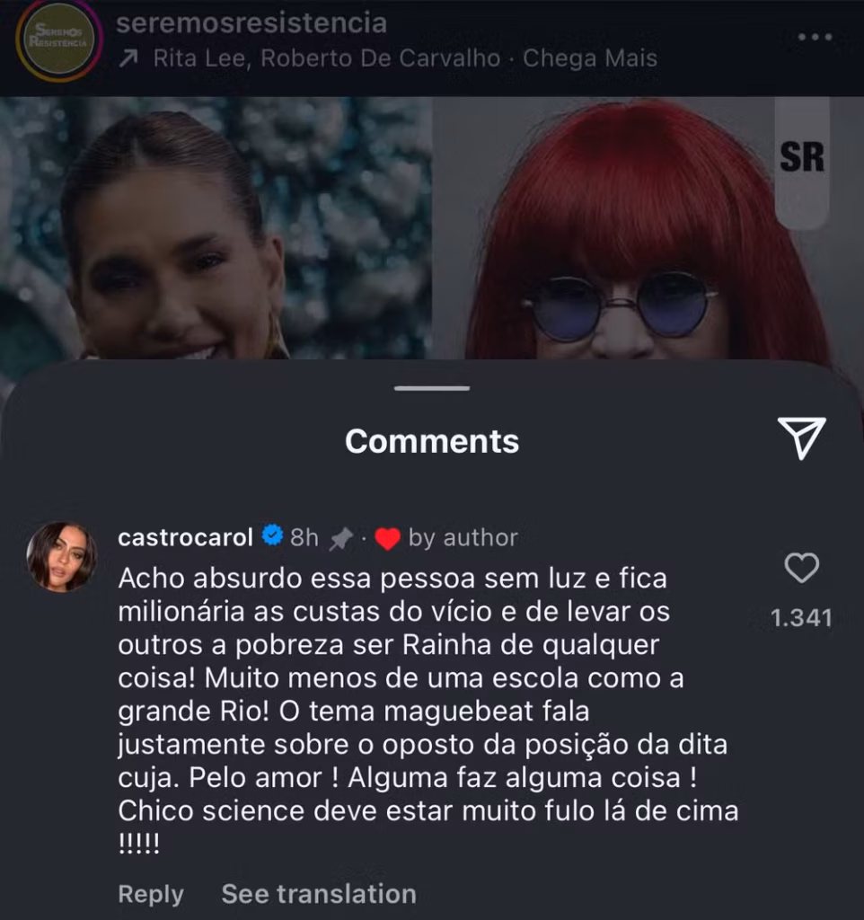 Acho absurdo essa pessoa sem luz e fica milionária as custas do vício e de levar os outros a pobreza ser Rainha de qualquer coisa! Muito menos de uma escola como a grande Rio! O tema maguebeat fala justamente sobre o oposto da posição da dita cuja. Pelo amor! Alguma faz alguma coisa! Chico science deve estar muito fulo lá de cima!”, escreveu Carol.