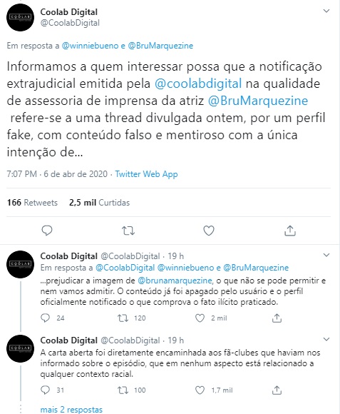 Já uma internauta questionou Bruna e afirmou que processar uma pessoa por chamá-la de racista era ainda mais racista. A atriz, porém, disse que a ação judicial exclusivamente sobre um perfil. Ela ainda compartilhou prints de tela da “thread” publicada contra ela.
