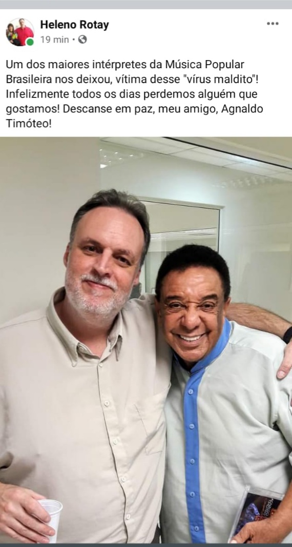 “Meu amigo de voz firme e coração gigante!”, escreveu Cidinha. “Um dos maiores intérpretes da Música Popular Brasileira nos deixou, vítima desse ‘vírus maldito’! Infelizmente todos os dias perdemos alguém que gostamos! Descanse em paz, meu amigo, Agnaldo Timóteo!”, publicou Heleno.