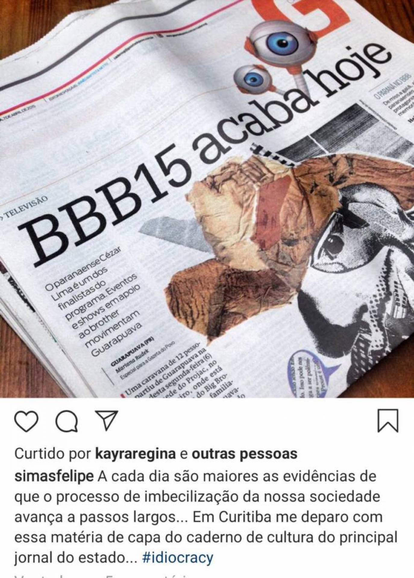 Empresário da cantora Manu Gavassi, terceira colocada no “Big Brother Brasil 20”, Felipe Simas teve uma publicação antiga nas redes sociais vindo à tona nas últimas horas, após descoberta feita pela coluna da jornalista Fábia Oliveira, no jornal O Dia. Na postagem, feita no dia 7 de abril de 2015, Simas afirma que o reality show faz parte de um “processo de imbecialização”.
