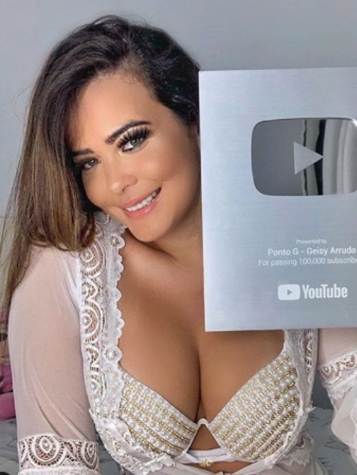 Geisy Arruda causou alvoroço nas redes sociais, nesta terça-feira (16). A digital influencer alcançou a marca de 100 mil inscritos em seu canal no Youtube, Ponto G, e, para comemorar e agradecer aos fãs, publicou fotos sensuais ao lado da plaquinha oficial do site.