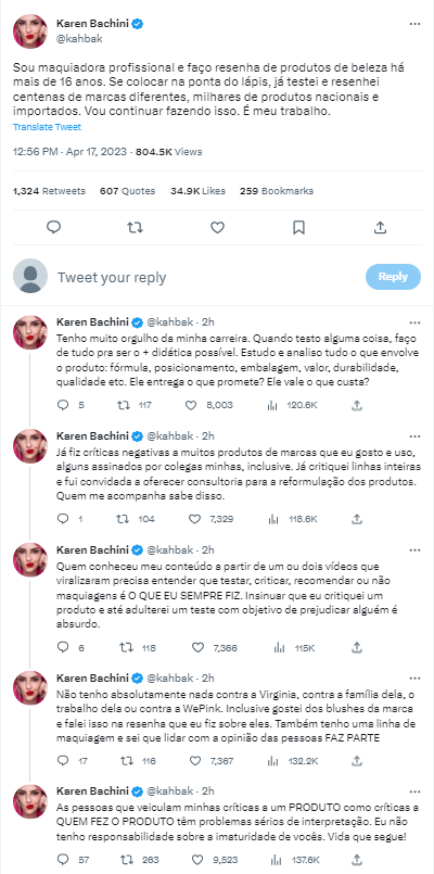 Nas redes sociais, Karen disse: “Sou maquiadora profissional e faço resenha de produtos de beleza há mais de 16 anos. Se colocar na ponta do lápis, já testei e resenhei centenas de marcas diferentes, milhares de produtos nacionais e importados. Vou continuar fazendo isso. É meu trabalho.”, iniciou.