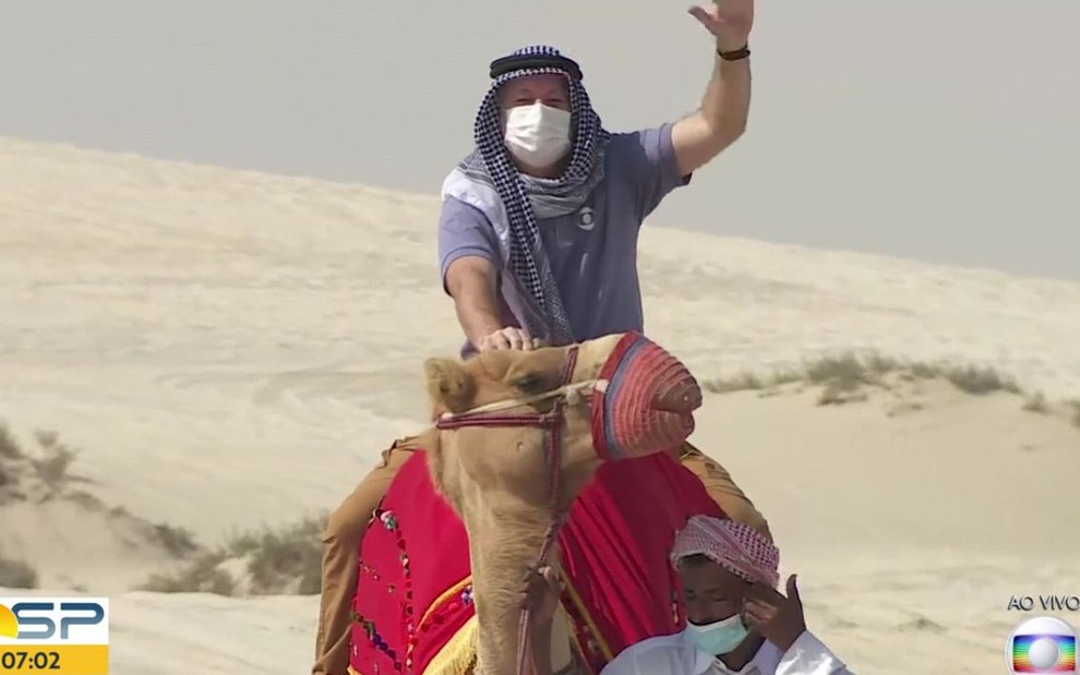 O repórter Renato Peters protagonizou uma cena inusitada, na manhã desta quarta-feira (10), durante o “Bom Dia SP”, da TV Globo. Em uma entrada ao vivo no telejornal, Peters apareceu em cima de um camelo, no meio do deserto de Doha, no Catar. “Eu vou ter que ficar aqui (em cima do camelo) até o fim, porque a minha calça rasgou”, revelou o jornalista, levando aos risos Rodrigo Bocardi e Alessandro Jodar no estúdio.