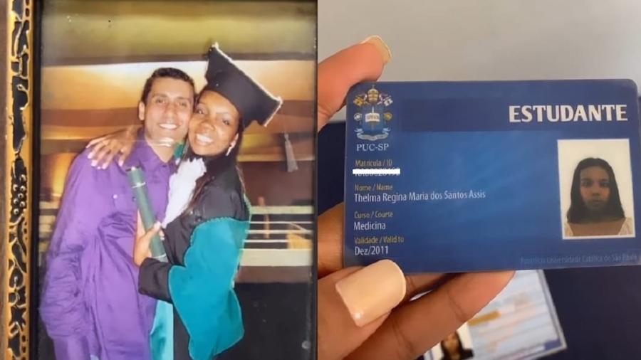 Além da foto na formatura, Thelma ainda exibiu a carteirinha de estudante da universidade onde se formou, a PUC São Paulo. A médica continuou mostrando itens pessoais, como seu carimbo cheio de strass e uma pasta com diversos documentos de seu casamento.