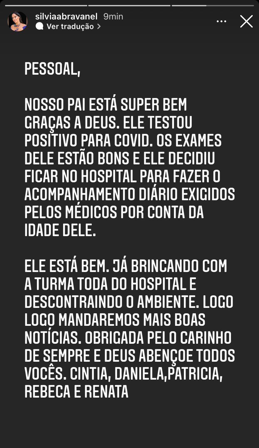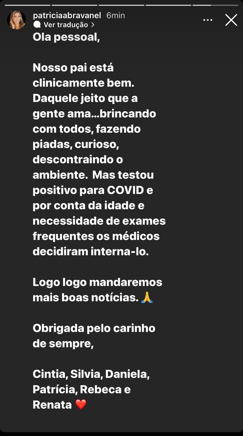 Ainda segundo a comandante do programa “Vem Pra Cá”, os médicos optaram pela internação do proprietário do SBT “por conta da idade e necessidade de exames frequentes”. “Logo, logo mandaremos mais boas notícias”, conclui o texto postado por Patrícia, que é assinado por ela e as demais irmãs.