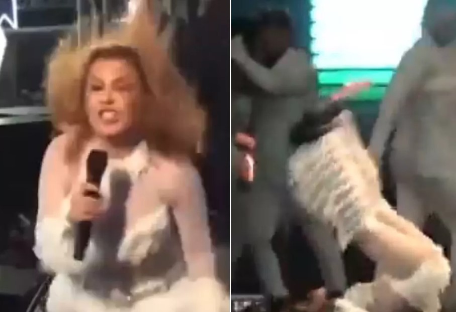 A famosa se apresentada em Medeiros Neto, na Bahia, quando caiu, ficando com as pernas para cima. Joelma, apesar disso, não perdeu o rebolado e continuou cantando.