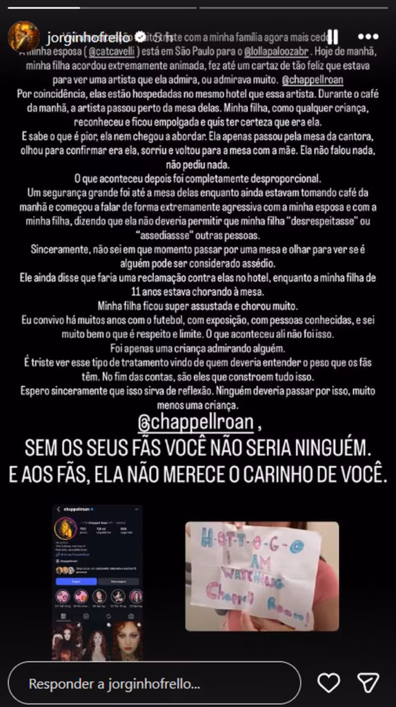 A polêmica começou com um relato publicado pelo próprio Jorginho nas redes sociais. O volante contou que a filha Ada, de 11 anos, estava animada para o festival e havia até feito um cartaz para a cantora. No café da manhã, a menina teria apenas olhado para a mesa de Chappell ao passar pelo local para confirmar que era ela, sem chegar a abordá-la.