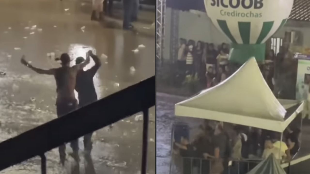 Entre as reações mais chamativas registradas no local, uma pessoa decidiu usar uma lata de lixo como refúgio contra a tempestade. O registro do momento mostra o folião dentro do recipiente, enquanto outros ao redor mantinham o espírito festivo.