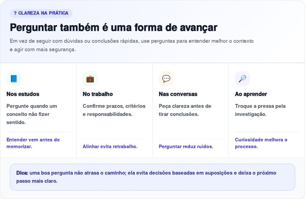 Na prática, esse minuto de possível constrangimento vale pouco perto do benefício. Uma pergunta bem feita pode economizar tempo, evitar retrabalho e transformar uma informação solta em conhecimento útil.