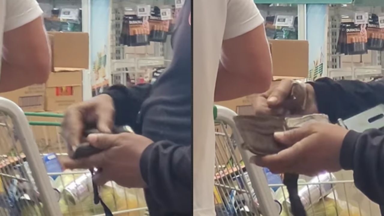 A cena chamou a atenção de quem estava na fila. Uma pessoa próxima filmou o momento em que o homem utiliza a chave para destrancar a carteira e, só então, acessar as notas guardadas dentro.