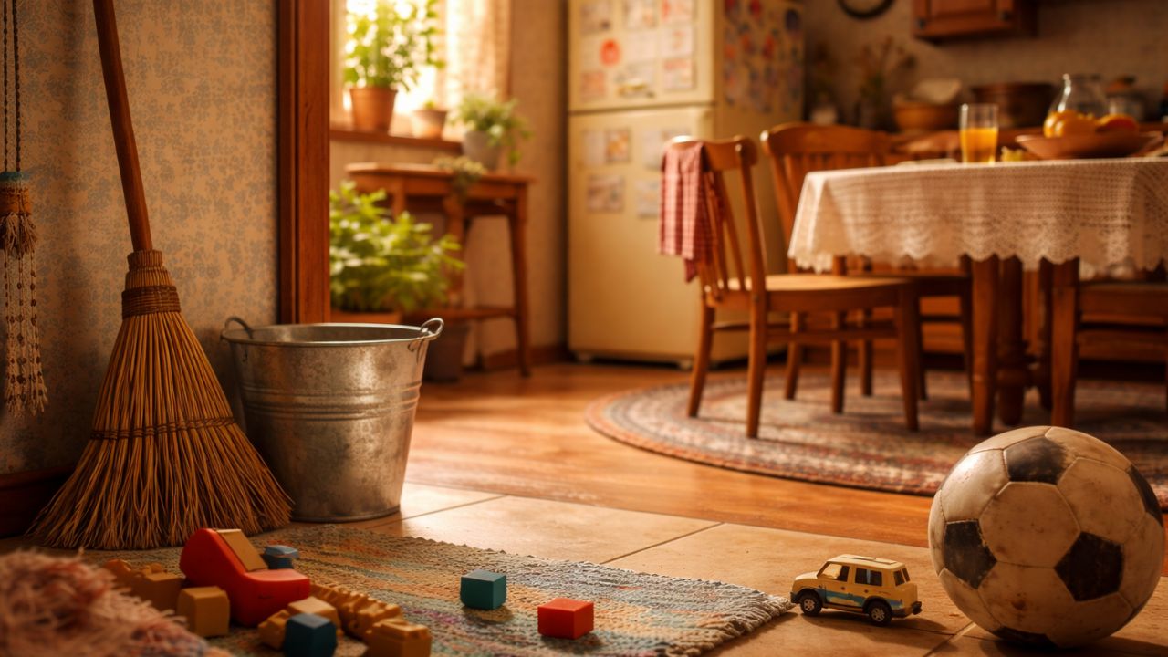 A combinação entre balde de alumínio e vassoura de piaçava formava quase um kit básico da limpeza doméstica, presente do início da manhã ao fim da tarde. As crianças observavam os adultos enchendo o balde, torcendo panos e varrendo o chão, e pouco a pouco assumiam pequenas tarefas, transformando esses objetos em parte do cenário dos primeiros aprendizados.