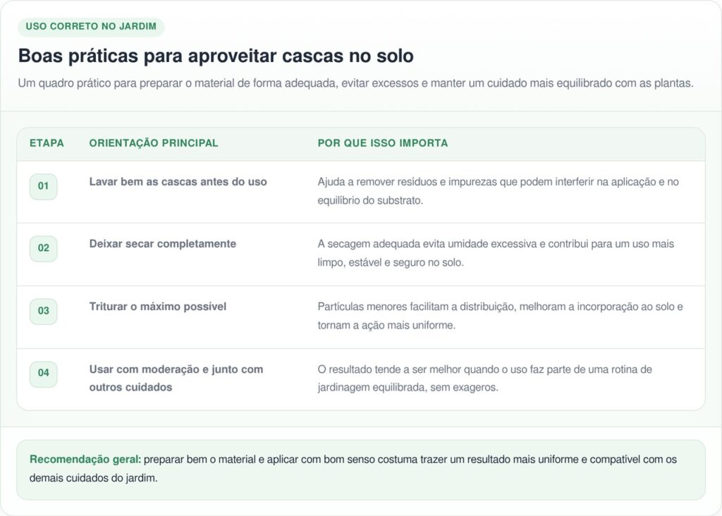 No jardim, a casca de ovo pode ser espalhada em pequenas quantidades ao redor das plantas ou incorporada ao solo. Em canteiros, ela entra como um reforço natural dentro de um manejo mais amplo, que inclui matéria orgânica, cobertura vegetal, poda, irrigação e observação constante do crescimento.
