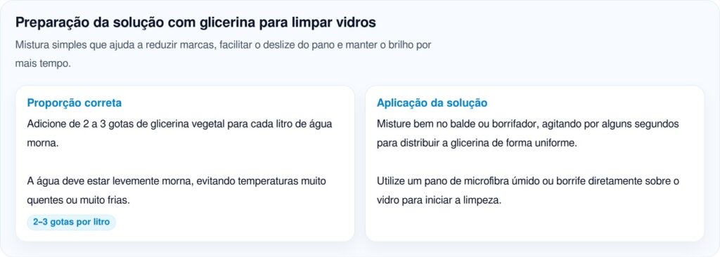 Usar gotas demais é o equívoco principal. A tentação de colocar mais glicerina para obter proteção extra acaba gerando uma película gordurosa que atrai mais sujeira do que repele. Mantenha sempre a proporção de duas a três gotas por litro. Outro erro frequente é pular a limpeza prévia dos vidros. Aplicar a solução sobre janelas com gordura acumulada, poeira grossa ou restos de outros produtos impede que a glicerina adira de forma uniforme ao vidro. Por fim, evite usar panos velhos ou toalhas felpudas, que deixam fiapos e marcas. Panos de microfibra limpos e reservados exclusivamente para os vidros garantem o melhor acabamento nas janelas da sua casa.