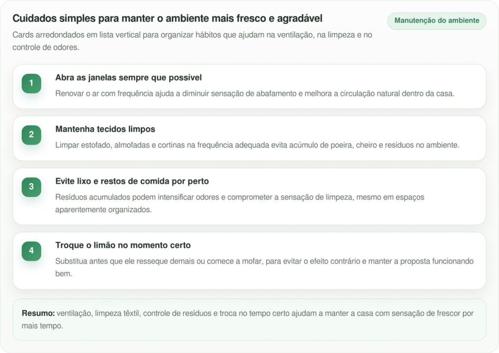 Boa parte do resultado depende mais da rotina da casa do que do limão em si. Para a sala ficar agradável por mais tempo, vale combinar esse recurso com medidas simples de manutenção.
