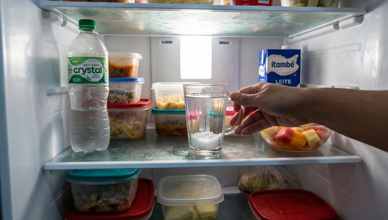Manter um copo com água e sal grosso dentro da geladeira não serve apenas para disfarçar cheiros. A combinação atua diretamente no microambiente interno do eletrodoméstico, ajudando a controlar a umidade e a manter o ar mais neutro mesmo com alimentos de odor intenso armazenados.