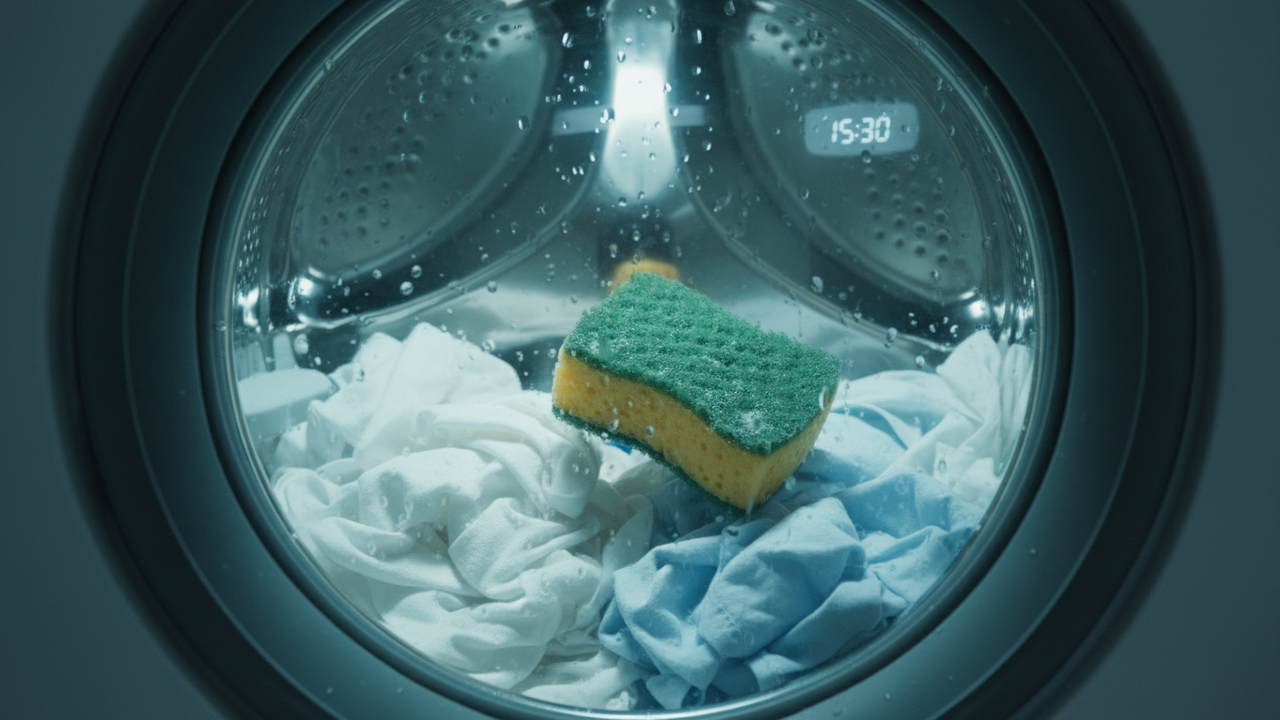 Esse truque parece estranho à primeira vista, mas virou assunto justamente porque resolve um incômodo bem comum: roupa que sai “limpa”, mas ainda com pelinhos, fiapos e resíduos grudados. A ideia é simples: usar uma esponja limpa dentro do tambor para segurar parte dessa sujeira durante a lavagem, reduzindo o que volta para as peças e o que vai parar nos cantinhos da máquina.