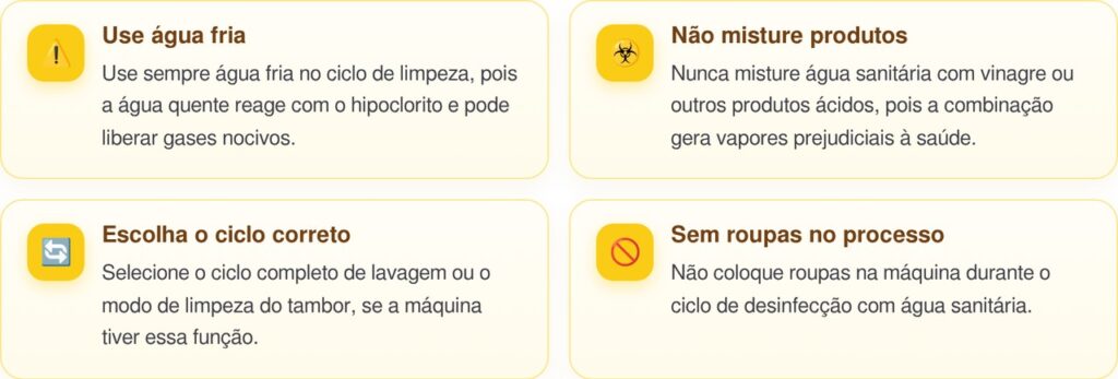 Antes de começar, coloque luvas de borracha e abra as janelas para garantir ventilação adequada no ambiente. A água sanitária deve ser despejada diretamente no tambor da máquina de lavar roupas, nunca no compartimento do sabão, pois o contato com as peças plásticas do dispenser pode causar danos ao longo do tempo.