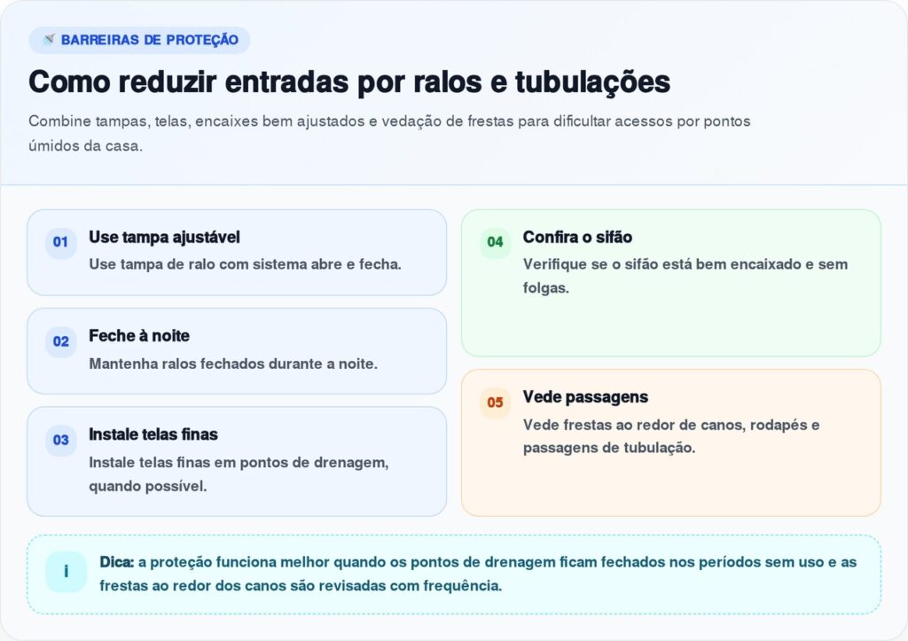 A primeira medida é dificultar o acesso físico. Ralos com grelha frouxa, tampa quebrada ou abertura grande permitem a passagem de insetos. Em muitos casos, trocar a tampa por um modelo abre e fecha já reduz bastante a entrada de baratas.