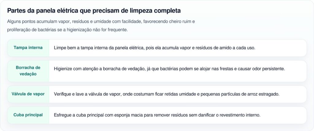 O grande erro na rotina de limpeza é focar apenas na cuba removível. A tampa da panela elétrica, a borracha de vedação ao redor da borda e a válvula de vapor são pontos onde resíduos e bactérias se acumulam sem que o dono perceba. Enquanto essas áreas não forem higienizadas, o mau cheiro vai voltar e o arroz vai continuar estragando mais rápido a cada uso.