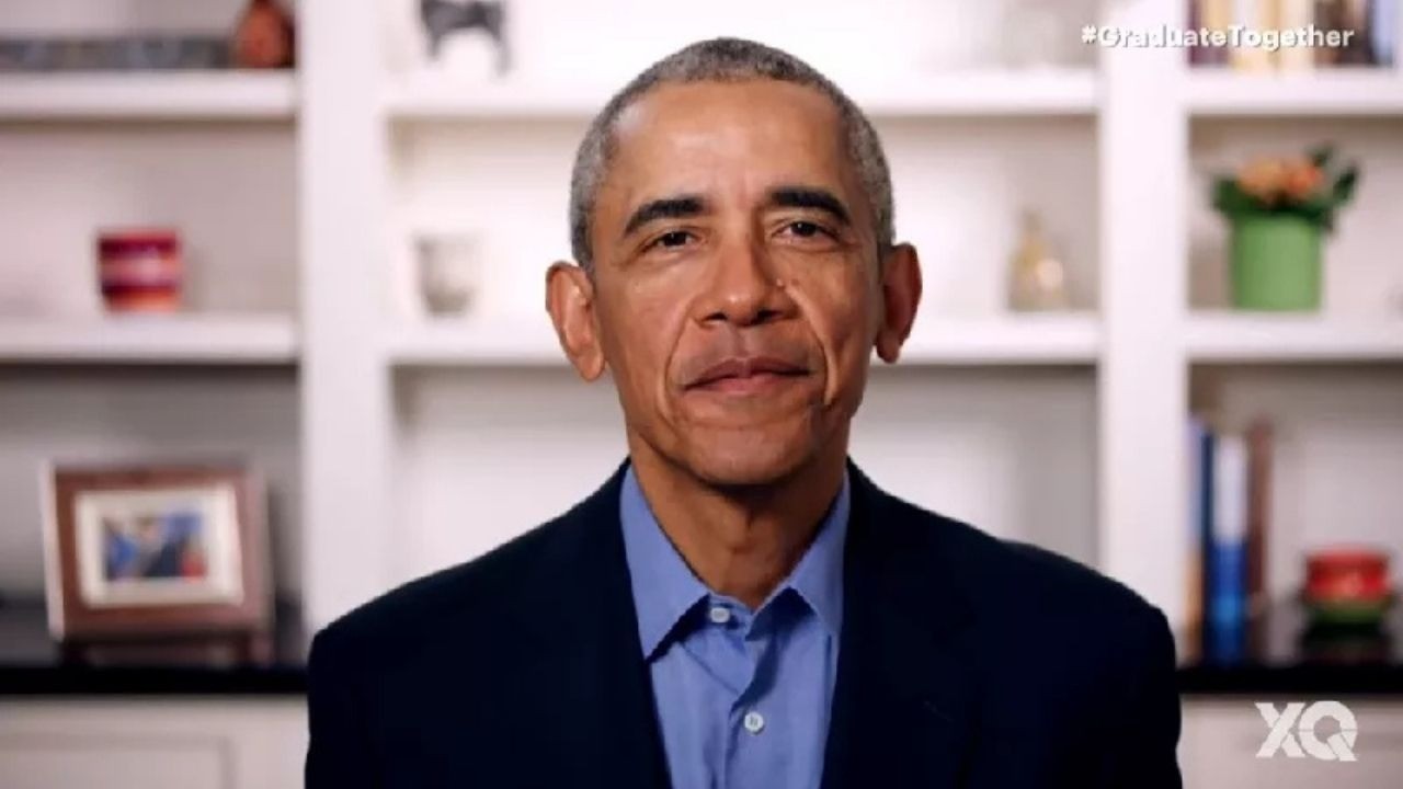 Barack Obama sorri, vestindo terno azul, com estante branca ao fundo. Logo XQ e hashtag #GraduateTogether.