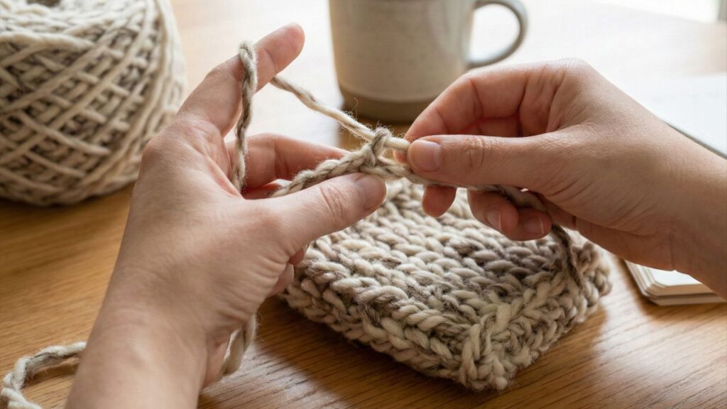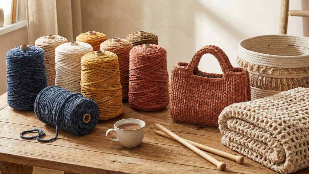 O mesmo material também é indicado para mantas, maxi mantas e cestos decorativos, o que mostra a versatilidade desse tipo de fio no artesanato contemporâneo. Para iniciantes, o fio grosso facilita enxergar as alcinhas e corrigir eventuais erros.