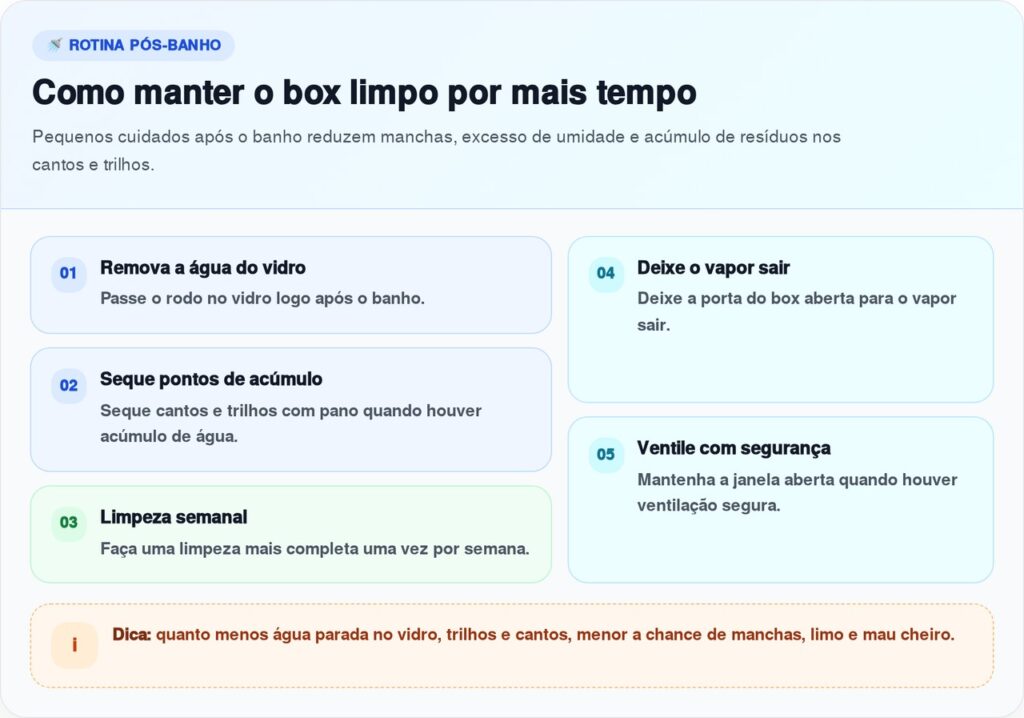 A manutenção diária é o que mais muda o resultado. Depois do banho, passe um rodo de pia ou rodo próprio para vidro nas portas do box. Esse hábito remove boa parte da água antes que ela seque e deixe minerais na superfície.